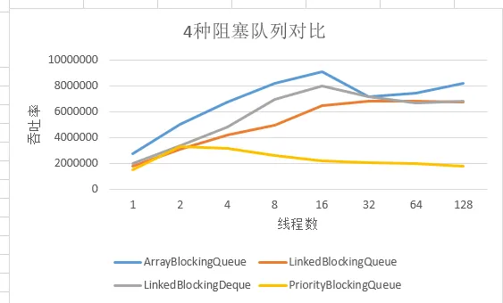 以下是针对ArrayBlockingQueue、LinkedBlockingQueue、LinkedBlockingDeQue、PriorityBlockingQueue几种阻塞队列进行的横向测评。硬件环境还是和上述相同。jdk还是采用1.8的API。