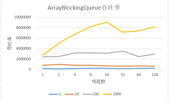 以下是我们针对ArrayBlockingQueue的性能测试结果,我的电脑硬件环境是: